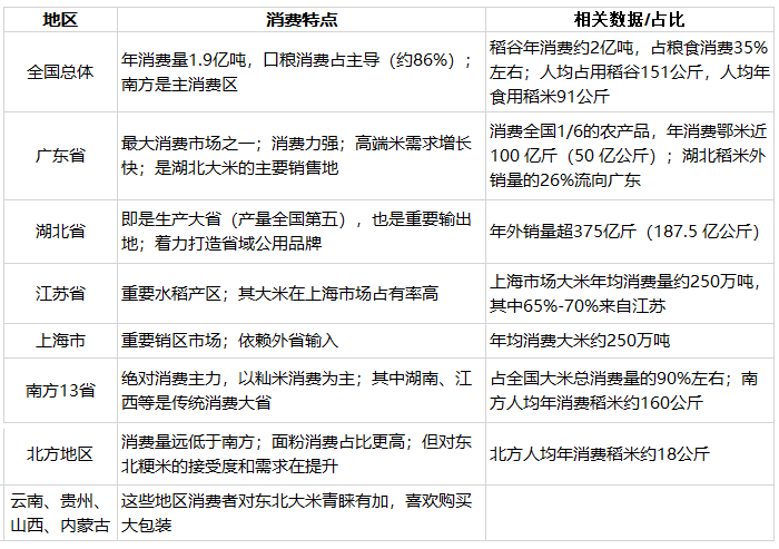 南方地区 (13省) 绝对消费主力;以籼米消费为主;其中湖南、江西等是传统消费大省,占全国大米消费总量的90%左右;南方人均年消费稻米约160公斤。